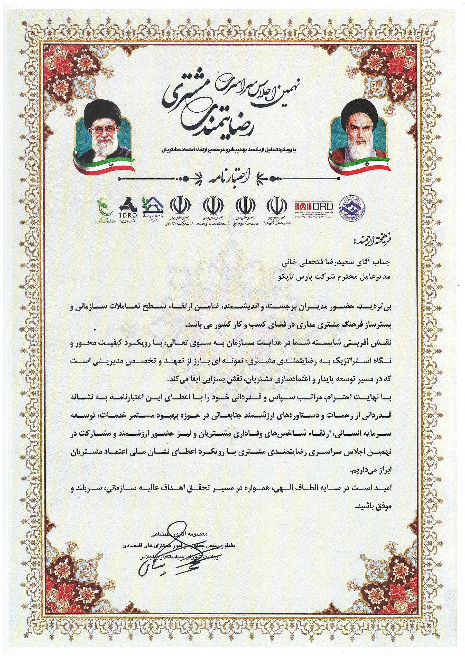 شرکت پارس تاپکو موفق به دریافت لوح تقدیر و تندیس نهمین اجلاس سراسری رضایتمندی مشتری جهت سال ها تلاش بی وقفه در حوزه ارتقای خدمات و کیفیت محصولات، توسعه سرمایه انسانی و ارتقای شاخص های وفاداری مشتریان گردید.